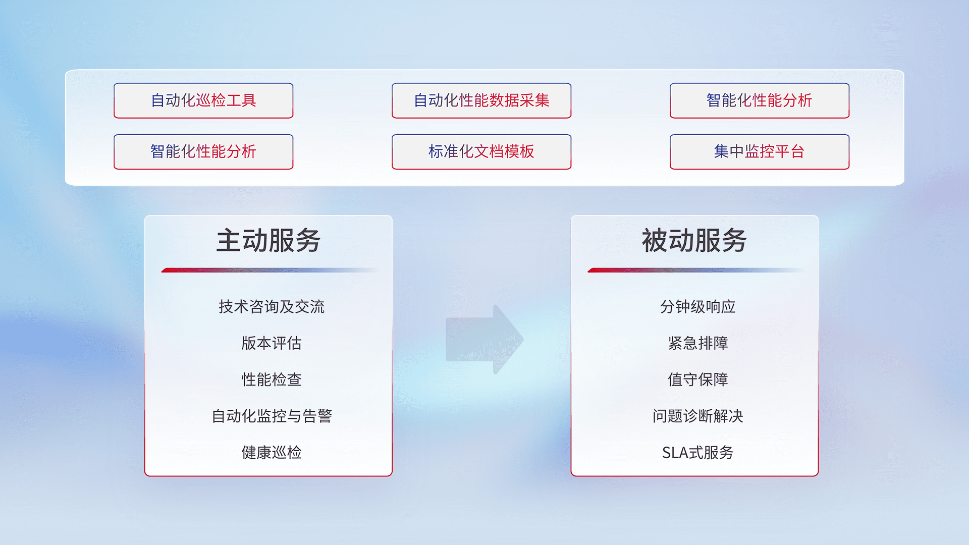 智能化工具和标准化文档,,保障服务质量,,,,提供主动服务(包含技术咨询、、、版本评估、、性能检查、、自动化监控与告警、、、、健康巡检)和被动服务包含(分钟级响应、、、紧急排障、、、值守保障、、、问题诊断解决、、、SLA服务)。。